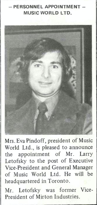 I then worked for Larry Letofsky at Yorkdale Shopping Centre. I became the warehouse Manager/Buyer for the chain of Music world Stores, and John Carnegie worked with me in the warehouse. These were all good years.